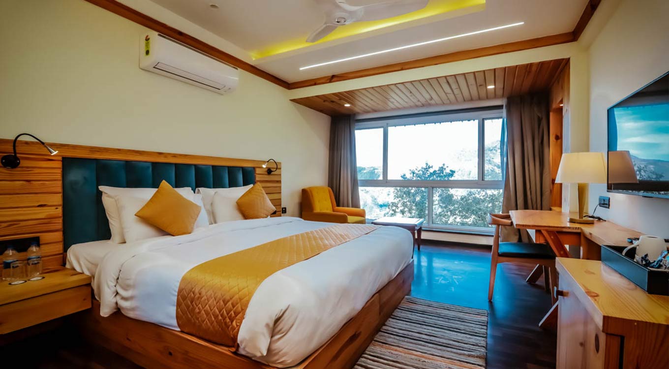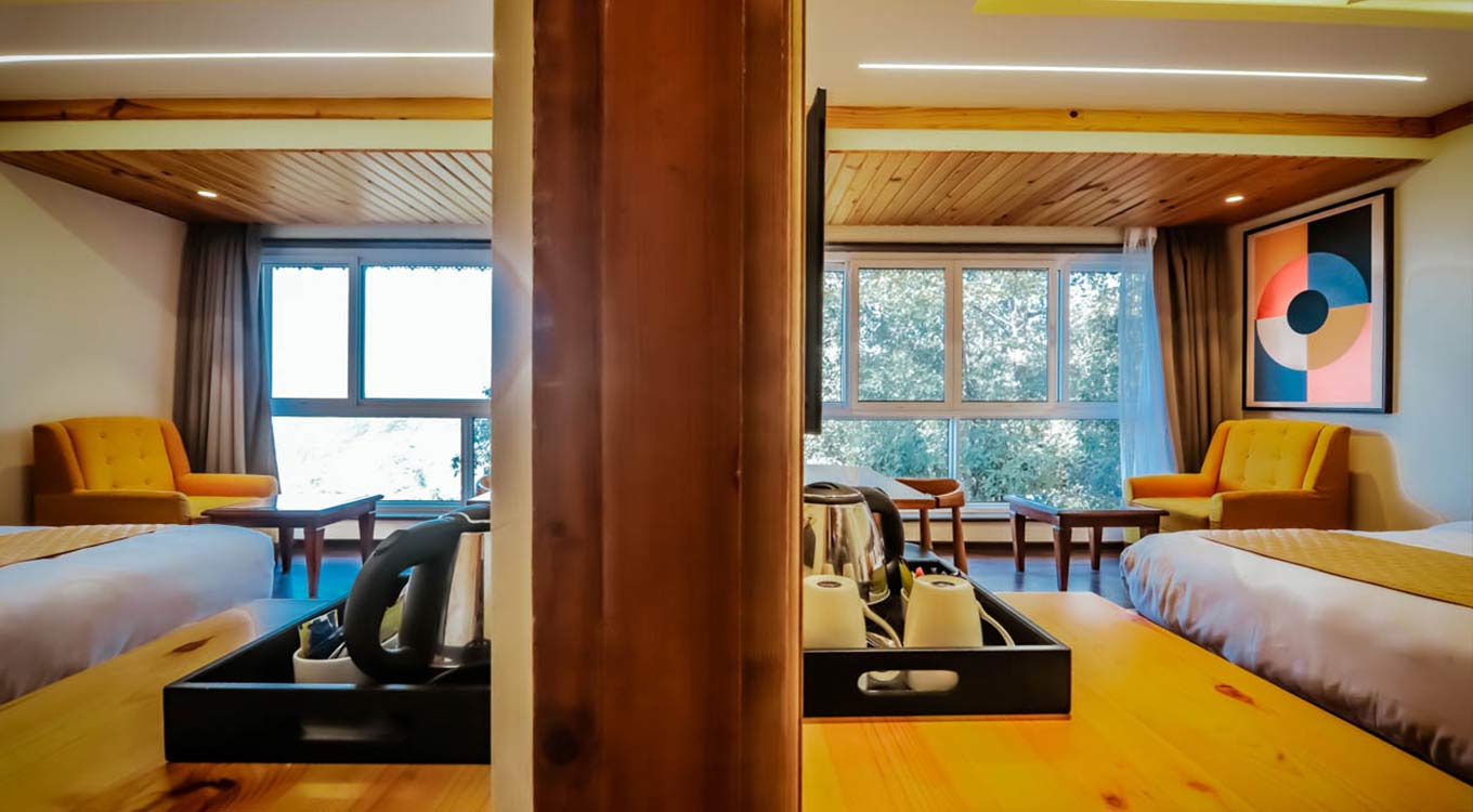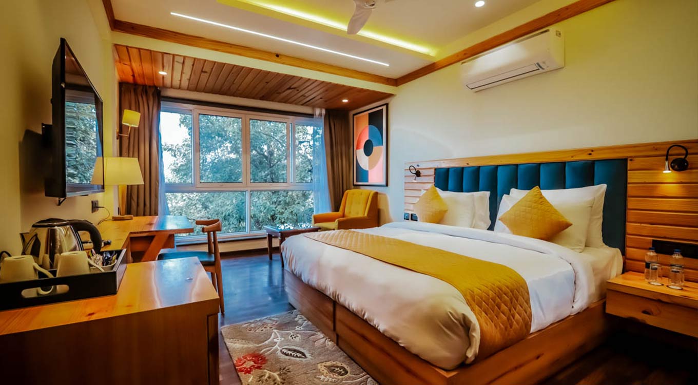 Our Superior Rooms cover an area of 230 square feet and boast breath-taking valley views. Each centrally air-conditioned room combines comfort with elegance, featuring tea and coffeemakers for your convenience, fully automatic doors, a safe in the room and more! Unwind on our king-sized beds or complete tasks at our ergonomic work tables amidst magnificent scenery of Mussoorie.